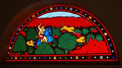 Das ganze Ambiente ist hier geschmackvoll aufeinander abgestimmt, vom gelb-beige karierten Marmorboden bis hin zu den Stoffen der Gardinen, die selbstverständlich zum Bettüberwurf passen. Vor dem Bett liegen Teppiche, damit man beim Aufstehen keine kalten Füße auf dem Marmorboden bekommt. Etwas Besonderes sind auch die Fenster, die mit hölzernen Läden zu schließen sind. Einige haben noch ein kleines Fenster in der Mitte. Oben auf dem Bild ist unser Zimmer zu sehen: der gesamte Erker mit den dunklen Läden ist das Bad, die 5 Fenster rechts daneben gehörten zum Zimmer. Auf der anderen Seite, in Richtung Pool und im Bad befinden sich kleine Kunstwerke aus buntem Glas über den Fenstern, die Jagdszenen oder Hofszenen zum Thema haben.