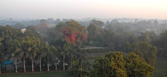 Angeblich hat man von der Dachterrasse aus einen schönen Blick auf das Taj Mahal, aber da die Luft in Agra heftig verschmutzt ist und sich sowohl am Abend als auch am Morgen Nebelschwaden über die Umgebung legten, verschwand das Gebäude in der grauen Masse und wir konnten nicht einmal erahnen, wo es sich denn befinden sollte. Unten ist der Ausblick von der schönen Dachterrasse zu sehen.