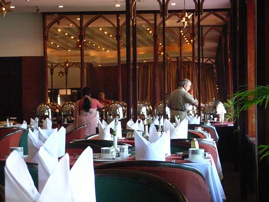 Im letzten Stock befindet sich das große Restaurant namens Mughal Room, von dort soll man ebenfalls mit Glück eine schöne Aussicht auf das Taj Mahal haben. Hier wurde neben dem Abendessen auch das Frühstück serviert, obwohl es neben der Lobby noch den Bansuri Coffee Shop gibt. Das Buffet ist recht üppig, nur die Hitze durch die zahlreichen warmen Gerichte in beheizten Servierschalen wirkte sich nicht gerade positiv auf den daneben liegenden Käse aus.