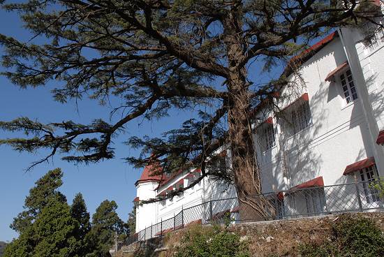 Der steile Aufstieg von der Mall, der Fußgängerzone mit Einkaufsmöglichkeiten, überwindet fast 100 Höhenmeter und führt vorbei an einer alten Kirche. Der Blick ins Umland ist sehr schön, vom Hotel aus blickt man auf das Doon Valley und die bebauten Hügel und Pinienwälder von Mussoorie.