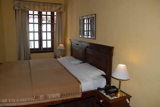 Es gibt 24 Zimmer im Kasmanda Palace, alle mit Bad, Fernseher und Telefon. Sie sind im so genannten Anglo-French Stil und somit recht gemütlich eingerichtet. Das Hotel war durch die Konferenzteilnehmer fast ausgebucht und man gab uns ein recht großes Zimmer am Ende des Ganges in einem der Eck-Türme, Zimmer Nummer 5. Im Gang befinden sich, wie bei so vielen Heritage Hotel, Jagdtrophäen, historische Fotos und alte Möbel mit dem Charme der frühen Jahre.