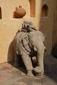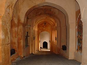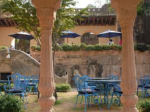 NEEMRANA FORTDirekt nach der Landung in Delhi am frühen Morgen, nach einem Nachtflug ohne viel Schlaf, fuhren wir zu unserem ersten Hotel: Neemrana Fort Palace. Dort kamen wir natürlich aufgrund der Nähe zu Delhi schon gegen Mittag an und mussten uns leider noch ein wenig gedulden, bis unser Zimmer bereit war. Im schattigen Hof auf den Korbsesseln wartend fielen uns beinahe die Augen zu. Erst später bei unserem Erkundungsgang entdeckten wir den wunderschönen Pool mit Sonnenliegen, auf denen wir gut ein Mittagsschläfchen hätten halten können. Leider machte uns niemand darauf aufmerksam.