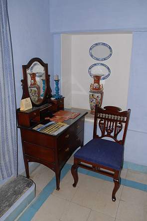 Unser Zimmer, welches wir nach einiger Warterei dann endlich beziehen konnten, befand sich auf Eben 8, schräg über dem Restaurantbereich. Es hieß Chini Mahal, was so viel wie Porzellanpalast bedeutet. Es gab ein großes Doppelbett und der Raum war hauptsächlich in freundlichen Blau- und Türkistönen gestrichen. Passend dazu gab es natürlich auch Porzellanteile mit blauem Muster. Raffiniert war ein Teil der historischen, nicht gestrichenen Wand über dem Bett, welche man einfach eingerahmt und somit hinter Glas gepackt hatte.
