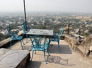Wie erhofft konnten wir in Neemrana das Frühstück im Garten einnehmen. Es gab natürlich auch einen Frühstücksraum mit Air Condition, aber wenn man sich das Essen drinnen holte konnte man an den blauen Tischen auf dem Rasen Platz nehmen, oder auf einer Steinbank mit langen Kissen direkt an der Mauer mit Blick ins Tal. Die Luft war dunstig am Morgen, besonders hier am Rande von Delhi leidet das Land unter chronischer Luftverschmutzung, gerade im Winter, wenn noch vielerorts mit offenen Feuern geheizt wird. Beim Frühstück konnten wir die kleinen frechen Streifenhörnchen und diverse Vögeln beobachten.