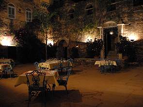 Das Abendessen im Neemrana Fort Palace war ein Highlight. Zwar gab es hier nur Buffet, was von uns nicht immer als optimal angesehen wird. Hier war es zzudem sehr teuer, nämlich 700 Rupien plus Tax, aber dafür auch sehr gut. Dazu kam die sehr romantische Dekoration. Zuerst begab man sich an die Bar am anderen Ende der Anlage, dort spielten gegen 19 Uhr rajasthanische Musiker zu Unterhaltung. Vor dem Restaurantbereich wurden die Tische im Freien nett gedeckt, idyllisch beleuchtet mit Kerzen und Lichterketten an den Wänden und in den Bäumen. Dort sass man dann auf blauen Stühlen rund um einen Seerosenteich, der natürlich auch iluminiert war.