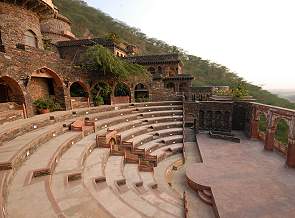 Hier in Rajasthan gibt es noch das Kesroli Hill Fort, zu dem wir eigentlich wollten. Leider war es ausgebucht. In Neemrana entstanden auf 10 ha Land nach und nach ein schöner Garten, hübsche Innenhöfe und Dachterrassen, viele unterschiedliche Zimmer und die öffentlichen Räumlichkeiten. Ein echter Knaller ist der wunderschöne Pool im neu erbauten Flügel. Ein wenig unterhalb befindet sich sogar ein Amphitheater für Aufführungen und weiter oben am Hang wurde 2007 gerade weiter angebaut.