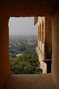Der Ort Neemrana ist ein typisches kleines Dorf, nur ein bisschen staubiger und schmutziger als viele andere. Dahinter befindet sich ein weitflächiges Industriegebiet, die Nähe zur Großstadt lässt die Immobilienpreise steigen und überall wird neu gebaut. In beiden Teilen des Ortes gibt es leider nicht Besonders viel zu sehen. Die letzte Seitenstraße zum Hotel hin war 2007 in einem erbärmlichen Zustand. Doch wenn man dann den Eingang zum Fort erreicht hat, befindet man sich direkt in einer anderen Welt. Die Anlage mit der Landeskategorie 5 Sterne liegt als Terrassenbau vielstöckig am Hang der Aravalli Berge, umgeben von lichtem Wald, in dem Schweine, Pfauen, viele Vögel und Affen leben. Im Inneren ist es ruhig und idyllisch.