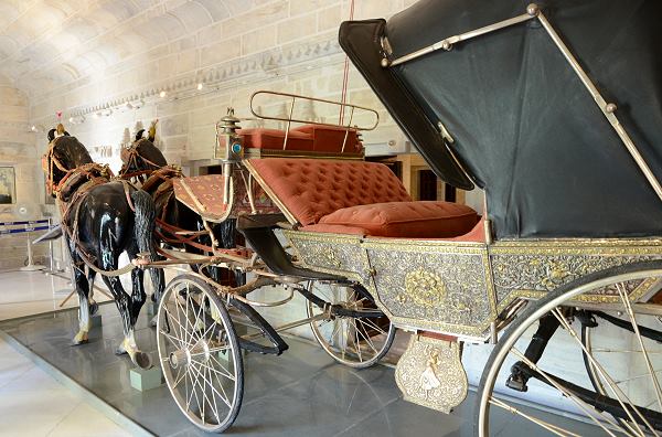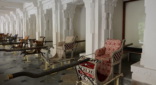 Während hier noch viele Besucher waren, waren wir in der benachbarten bemerkenswerten neuen Abteilung im Zeena Mahal fast alleine. Es gibt hier nebenan auch eine umfangreiche Sammlung an prächtigen Sänften und Elelfantensätteln, Tragen und Kutschen.