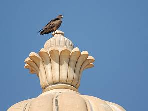 Durch den Haupteingang, über dem ein goldenes Sonnenemblem prangt, gelangt man schließlich in das Palast-Museum. Das Symbol des Hauses von Mewar bedeutet edelste rajputische Herkunft und dominiert die wehrhafte Fassade mit den zahlreichen Erkern. Raubvögel ziehen ihre Kreise über den Dächern und lassen sich auf den Kuppeln nieder.