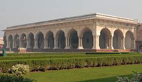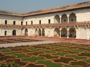 In der Mitte der Halle befindet sich eine reich verzierte Thronnische, dahinter befinden sich Privatgemächer, die aber nicht zugänglich sind. In der Mitte des großen Hofes vor der Halle befindet sich des im gotischen Stil gehalten Grab von John Russel Colvin, dem Vizegouverneur der Nordwestprovinzen. Er wurde während des Sepoy-Aufstands 1857 an dieser Stelle getötet. Ebenfalls angrenzend an den Hof sieht man das Dach der Moti Masjid, der berühmten Perlen-Moschee. Sie gehört zu den besonders sehenswerten Bauten des Forts und ist die größte, aus Marmor gestaltete Moschee der Welt. Leider ist sie wegen Renovierungsarbeiten nicht für die Öffentlichkeit zugänglich. Unterhalb der Moschee, in einem kleinen abgeschlossenen Hof, liegt der Meenabasar. Einmal im Jahr durften hier die sonst im Harem im Verborgenen lebenden Hofdamen kleine Marktstände aufbauen. Nur an diesem Tag kamen sie in Kontakt mit den männlichen Palstbewohnern.