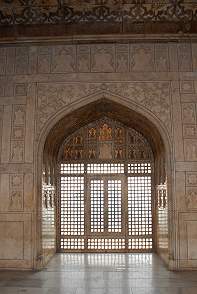 Weiter führte uns der Rundgang durch den Sommerpalast mit einer raffinierten Wasserkühlung namens Shahi Hammam. Original erbaut von Akbar und renoviert von Shah Jehan, wurde der geschlossene, nur zur Flusseite hin offene Komplex im Sommer durch raffinierte Führung von Wasser in Tanks und über Marmorplatten gekühlt. Angeblich hat man bis heute nicht herausgefunden, wie das Wasser aus dem Fluß bis in diese Höhe gefördert wurde.