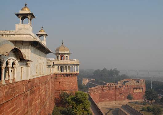Es gibt drei weiße Pavillons am Rande einer großen Marmorterrasse, von denen man einen wunderschönen Blick auf den Fluss und den Taj Mahal hat. Beide sind gleich gebaut und bestehen aus zwei, insgesamt ca. 15 m² großen Räumen. An den steilen Außenmauern nisten grüne Halsbandsittiche, unten an einem Wasserreservoir sahen wir einen Affenhorde und am blauen Himmel kreisten zahlreiche Raubvögel.