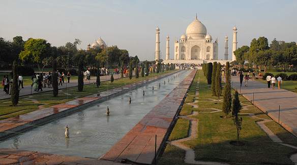 Im Garten waren Menschenmassen unterwegs und überall ließen sich Paare und Gruppen mit dem Taj Mahal im Hintergrund fotografieren. Es gab sogar Fotografen, die herumliefen und ihre Dienste anboten. Gegen Geld fotografierten sie die Besucher mit deren eigener Kamera. Ein bunt gemischtes Volk aus Indern, Reisegruppen aus aller Welt und Einzelreisenden mit Privatführer war anwesend, unmöglich, ein Bild zu machen, ohne Menschenmassen im Vordergrund. Die in der Mittes des Wasergrabens plazierte Marmorplattform mit diversen Bänken ist der belibeste Aussichts- und Fotografierstandort. Für das berühmte Bild der verstorbenen Prinzessin Diana, die hier ganz alleine auf einer Marmorbank saß, wurde das Gelände natürlich extra abgesperrt.