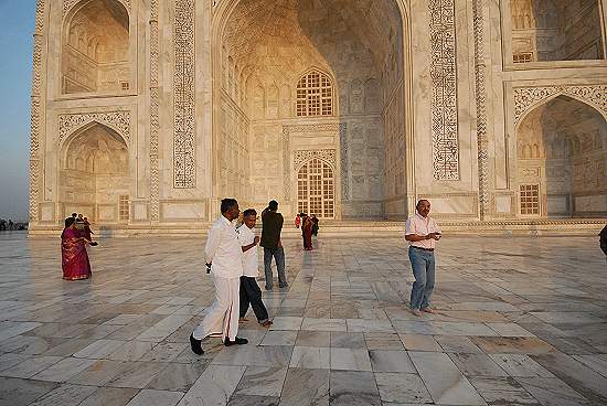 Obwohl der Raum eine hohe Kuppeldecke hat war die Luft darin grauenhaft stickig und die drängelnden Menschenmassen lösten in mir fast Panik aus. Einige Leute riefen irgendwas, um das Echo zu bestaunen, nicht sehr feierlich. Das diffuse Licht und die lauten Rufe der Leute erweckte in mir auch nicht die im Reiseführer beschriebene magische Stimmung, eher das Gegenteil war der Fall. Der Nachhall in der runden Kuppel bewirkte eine Art Desorientierung im Innenohr, uns beiden wurde schwindelig und übel. Ich wollte nur noch raus und verließ fluchtartig das Innere, um mich draußen auf den Marmor zu setzen und zu erholen . Nach einer Weile kamen Michael und unser Guide auch wieder heraus und wir bewunderten gemeinsam das inzwischen durch die untergehende Sonne golden angehauchten Mausoleum. Ja nach Sonnenstand wirkt das Taj Mahal anders.