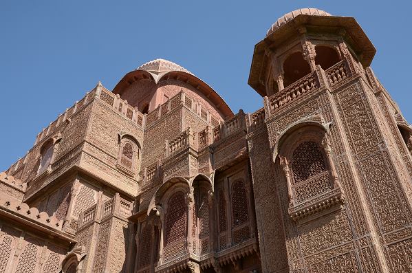 Im Jahr 2013 haben wir dann gar nicht zentral in Bikaner gewohnt, sondern in der südwestlich gelegenen grünen Oase des Gajner Palace mit dem umliegenden Gajner Wildlife Sanctuary. So hatten wir diesmal auf dem Weg dorthin einen halben Tag Zeit für die Besichtigung von Bikaner, denn die Haupt-Sehenswürdigkeit ist das mächtige Junagarh Fort im Zentrum mit seinen wunderschön ausgestatteten Palästen.