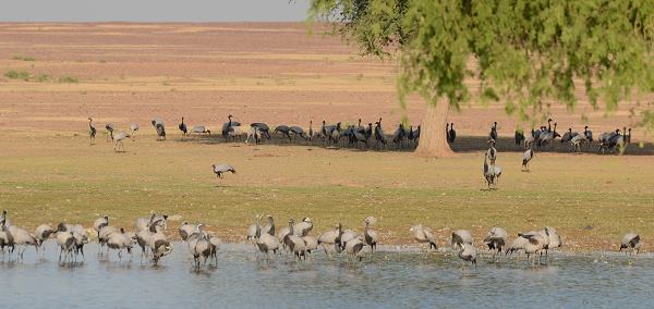 Wer auf dem Weg von Jaisalmer oder Phalodi in Richtung Bikaner unterwegs ist, sollte den kleinen Abstecher zum See machen. Zu unserem Erstaunen hielten sich hier nämlich nicht nur Menschen auf, eine Gruppe Kraniche konnten wir hier ebenfalls beobachten. Die werden weiter südlich in Kichean zwar gefüttert, aber am Wasserloch von Bhap saß ebenfalls eine große Gruppe der hübschen Vögel, unbehelligt von den Bewohnern. Ein Teil stand am Ufer, eine andere Gruppe hatte sich in den Schatten unter einen Baum zurückgezogen.