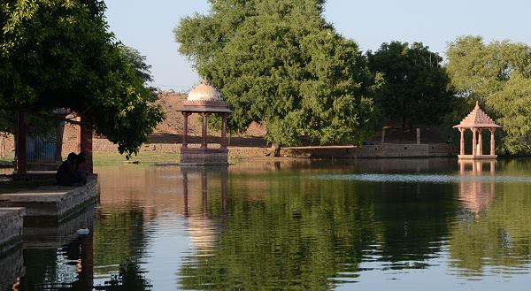 Auf dem Weg vom Hotel Barsingha Villa zu den Salzbauern fuhren wir durch den alten Ortskern von Bhap. Hier gibt es den üblichen Markt und ein par kleinere Tempel. Wie auch auf der Karte unten zu sehen ist die Anlage des Ortes relativ frei gestaltet, manche Wege wirkten, als gingen sie zufällig gerade noch zwischen den Gebäuden durch. Das kleine Zentrum des Ortes liegt im Osten auch gleich wieder am Rand, denn dort beginnt die sehenswerte Oase. Der See soll noch nie ausgetroknet sein und ist sehr sauber, denn die Bewohner von Bhap beziehen hier ihr Trinkwasser, da achtet die Gemeinschaft schon darauf, dass kein Müll im Wasser liegt.