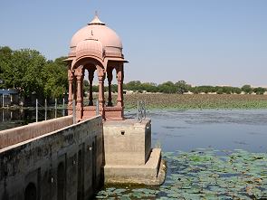 Abgesehen von dem ganzen Dreck im ufernahen Wasser ist die Umgebung für die Lage mitten in der Wüste für indische Verhältnisse fast schon idyllisch zu nennen. Es gibt schöne Fotomotive und vor allem Ruhe und Schatten. Vor dem Tempel stehen ein paar Händler bei denen man sich mit Getränken und Knabbereien eindecken kann.