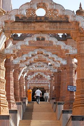 Besonders beeindruckend ist der Besuch des Sachiya Mata-Tempels, manchmal auch Sachay Mata oder Sachchiya Mata geschrieben. Die Bauern und Nomaden aus der Region pilgern gerne hierher zum Schrein der alten Erd-, Fruchtbarkeits- und Muttergottheit Sachiya. Sie erhoffen sich dadurch reichen Kindersegen, vor allem natürlich die Geburt gesunder männlicher Nachkommen. Am Eingang muss man sich in ein Buch eintragen, dort entdeckten wir auf den letzten Seiten auch einige Tourgroups aus Deutschland. Eintritt wird nicht erhoben, gegen eine Gabe in die Spendendose am Ende des Besuchs hat der freundliche Mann am Tor natürlich nichts einzuwenden. Beeindruckend sind die vielen Treppenstufen, die von reich verzierten Steinbögen überspannt werden. Linien auf dem Boden regeln die Pilgerströme, bei unserem Besuch war der Tempel auch gut besucht, aber nicht so sehr, das die Verkehrsregelung nötig gewesend wäre.