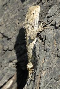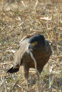 Den Rest des Tages verbrachten wir dann Fahrrad fahrend auf der Suche nach den Vögeln im Park, fanden aber mehr Kühe und vertrocknete Landschaften. Wasser gab es nur in der nähe des Hauptdamms, die meißten auf der Karte eingezeichneten Kanäle waren trocken. Ein Vogelparadies sieht definitiv anders aus. Am Wegrand waren als Höhepunkt einige Schakale zu sehen, es gab ein paar Affen, ein recht zahmer Wiedehopf ließ sich am Tempel ganz nah fotografieren, ein Adler verspeiste gerade eine Schlange und in einem alten Baumstamm entdeckten wir sogar eine Echse. Und das alles erst ohne Füher mit viel Zeit und Muße. Rast machten wir zwischendurch auf einer der Holzbänke. Am Abend waren wir dann mit einer dicken, grauen Staubschicht bedeckt. Am Nachmittag tranken wir auf dem Rückweg im Staatshotel namens Forest Lodge, dem einzigen innerhalb der Parkgrenzen, einen Tee. Hier war wenig los, alles wirkte etwas verschlafen und viele Touristen hatten sich auch nicht hierher verirrt.