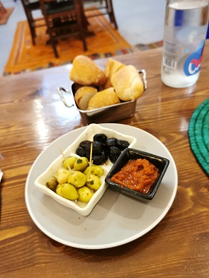Wir bestellten eine Flasche Wasser und dazu zwei frische Säfte. Die Speisekarte war recht umfangreich und wir waren hier, um Fisch zu essen. Als Gruß aus der Küche bekamen wir Brot mit zweierlei Oliven und Tomatendip.