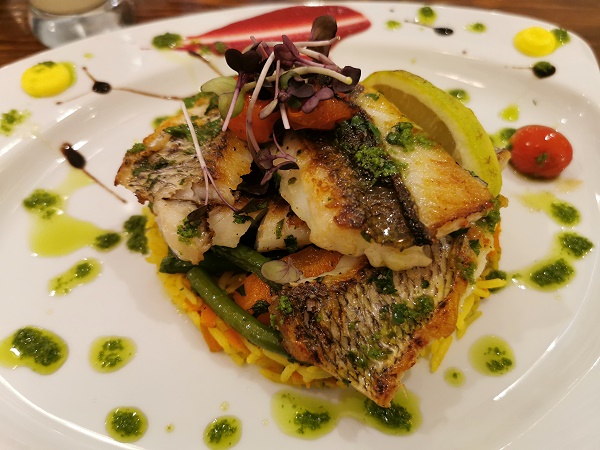 Frisch zubereitet und gerillt kam der Wolfsbarsch dann nett angerichtet mit Reis und Gemüse und das Fleisch ließ sich problemlos vom Skelett trennen.
