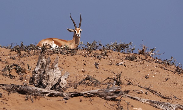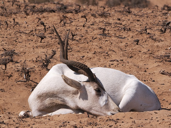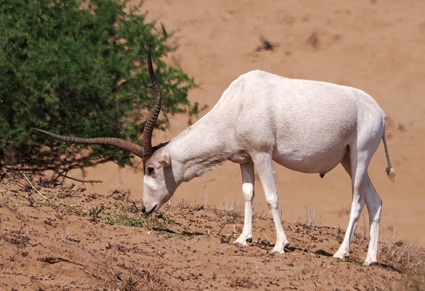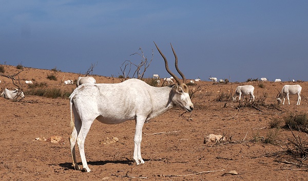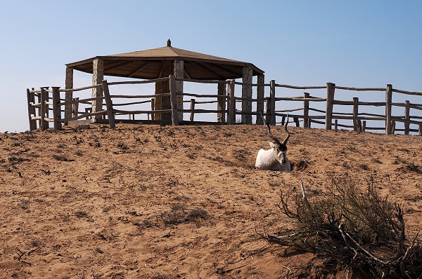 Neben den Straußen beheimatet das Schutzgebiet auch seltene und bedrohte Arten wie die Mendesantilope (Addaxantilope) und die Dorcasgazelle. Beide konnten wir beobachten. Die Mendesantilope, oder Addax (Addax nasomaculatus), ist eine eindrucksvolle Antilope aus der Familie der Pferdeböcke und mit den Oryxantilopen verwandt. Einst war sie in der gesamten Sahara verbreitet, heute ist ihr Bestand jedoch stark dezimiert und in einigen Rückzugsgebieten der Sahara stark gefährdet.