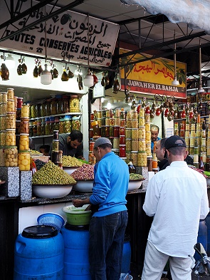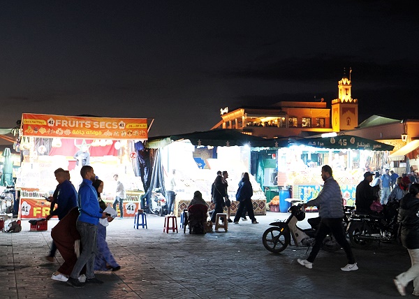 Bei Sonnenuntergang erwacht der Platz dann zum Leben, es werden zahlreiche Food-Stände aufgebaut mit lautem Trubel und geschickter Routine. Der Grill ist noch nicht an, da wird man schon angesprochen, ob man hier nicht essen will. Dabei sehen die meisten Stände gleich aus. Angeboten werden hier Spezialitäten wie Tajine, Couscous, gegrilltes Fleisch, Schnecken und Harira - eine sättigende marokkanische Suppe. Am besten sagt man, dass man sich die Standnummer merkt und später wiederkommt, dann hat man schnell seine Ruhe. Besonders skurril fanden wir die Schwarzafrikaner, welche im Dunkeln ihr Geschäft mit Sonnenbrillen betrieben.