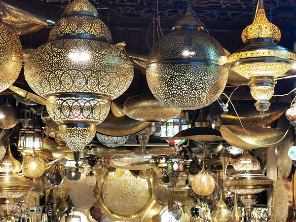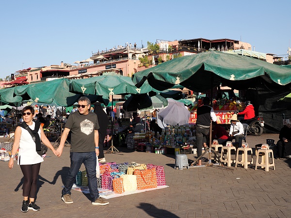Tagsüber herrscht reges Treiben. Es werden zahlreiche Stände aufgebaut und von Textilien, handgefertigten Lederprodukten, dem üblichen Touristenkram bis hin zu traditioneller Medizin wird hier alles verkauft. Dazwischen laufen noch als Wasserträger verkleidete Manner herum, die sich gegen Geld fotografieren lassen. Früher war das ein Beruf mit der Aufgabe, Wasser an Einwohner und Reisende zu verkaufen, bevor fließendes Wasser in Marokko verbreitet war. Sie tragen einen knallrote Kapuzenmantel mit goldenen oder silbernen Verzierungen und einen breiten Strohhut, der mit bunten Quasten verziert ist.