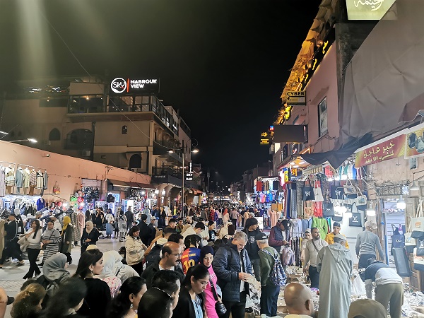 Die Touristen fallen in Scharen kurz vor Sonnenuntergang in den Restaurants am Rand des Djemaa el-Fna ein. Es gehötrt für viele zum Ritual, hier auf den Dachterrassen oder Balkonen einen Platz zu ergattern und dem Treiben auf dem Platz von oben zuzugucken. Natürlich spielt dabei auch der Sonnenuntergang eine extrem wichtige Rolle, den kann man aber auch von fast allen Dachterrassen in Marrakesch mit weniger Trubel und besserem gastronomischen Angebot bestaunen.