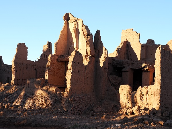 Als es mir dann am Abend endlich wieder etwas besser ging, machten wir noch einen Spaziergang in der näheren Umgebung vom Hotel. Das liegt ja nicht umsonst direkt am Fluss und ist von Feldern, Palmenhainen und verfallenen Lehmbauten umgeben. Beim Rundgang waren die Auswirkungen der letzten Überschwemmung deutlich zu sehen. In Richtung Fluss hatte sich das Steilufer einige Meter in die Felder hineingefressen und diese zum Teil weggespült und unterhöhlt. Entlang des Feldweges waren an einigen Stellen die Lehmmauern eingedrückt oder umgekippt. Die kleine Ansammlung alter und großer Lehmhäuser etwa 300 Meter vor dem Hotel war sehr stark beschädigt und einige Bauten eingestürzt. Am Rand der Ruinen stand in einer großen Lehmpfanne noch Wasser vom letzten Gewitter, umgeben von aufgebrochenen eingetrockenetn Lehmplatten.