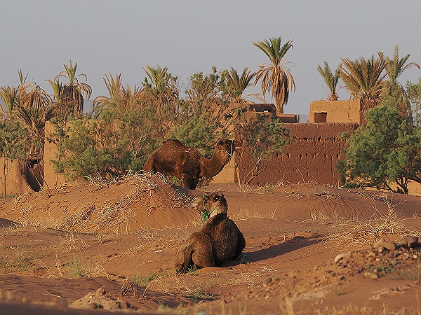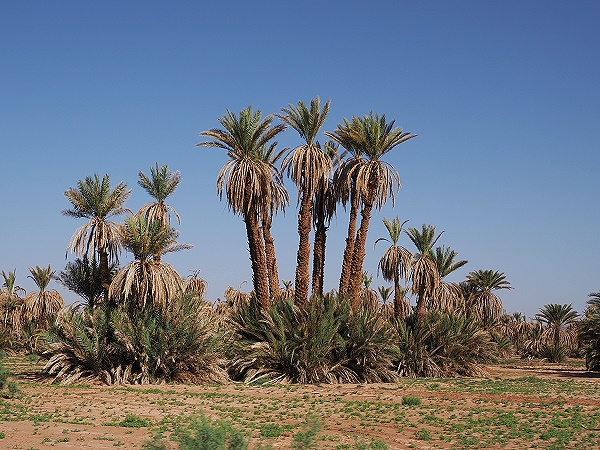 Unser Fahrt führte zuerst durch die Dünen vor dem Hotel und weiter durch die Wüstengebiete des südlichen Draa-Tals. Die Folgen der anhaltenden Dürre, die diese Region heimsucht, waren noch zu sehen. Dazu kommen die verheerenden Folgen der Bayod-Krankheit, einem Pilz, der Palmen befällt und sie abtötet.