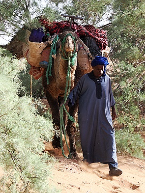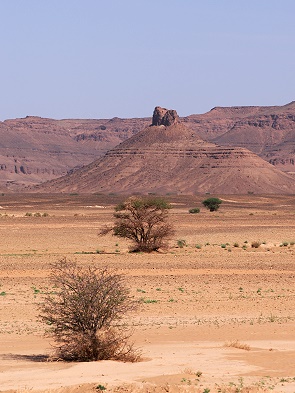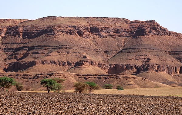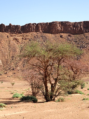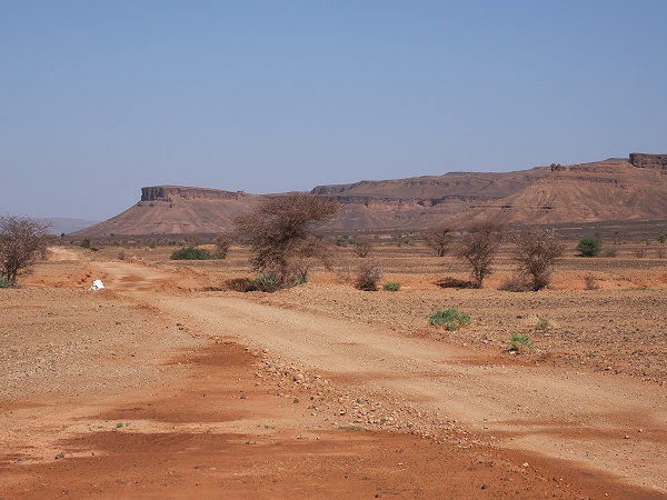 Die Straße führt dann wieder in Richtung Norden, vorbei an den Resten eines eingestürzten Plateaus, von denen nur noch die Ränder übrig sind, verkohlt und zerkratzt durch die Erosion unzähliger Wadis. Direkt dahinter befindet sich die Grenze zum benachbarten Algerien. Die Fahrt geht vorbei an Dörfern mit modernen Häusern und Zelten und ermöglicht uns einen Einblick in das Leben der Oasen und der Nomaden.