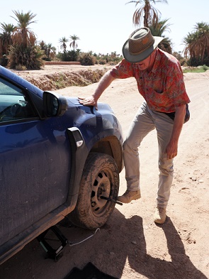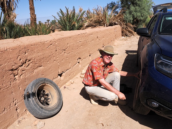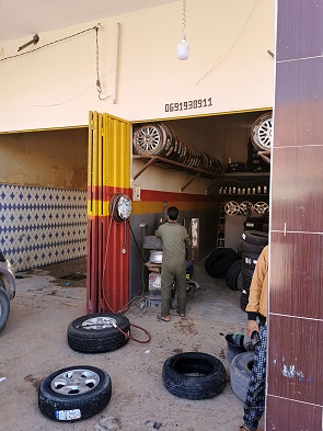Am nächsten Tag sind wir dann zu einer Werkstatt in Tagounite gefahren, wo zwei Löcher im Reifen gefunden wurden. Nachdem diese ihre passenden Flicken erhalten hatten wurde das Rad wieder mit dem Ersatzrad getauscht. Da wir ja rechtzeitig anghalten hatten war die Reifenflanke nicht beschädigt und eine Reparatur noch möglich. So hat uns das Ganze umgerechnet 10,00 Euro gekostet.