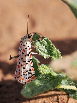 An einem malerischen Ort inmitten von Palmen hielten wir an und Juan machte viele Fotos von der ankommenden Gruppe. Wir waren mehr an den Pflanzen und dem hübschen Harlekin-Bär (Utetheisa pulchella) interessiert, der daran sass. Auch ein Taubenschwänzchen torkelte vorbei.
