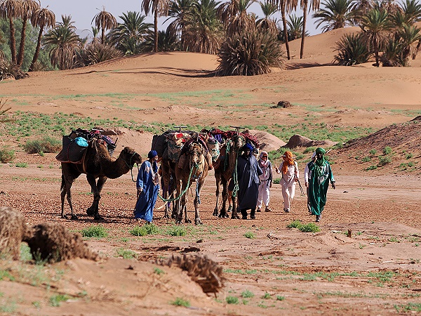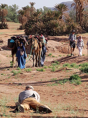 Am Mittag startete eine Reisegruppe zusammen mit dem Hotelbesitzer und Fotografen Juan Antonio Munoz in der Casa Juan auf Kamelen. Wir folgten dem Offroader von Juan in eine nahe Palmenose, in der er Fotos und Videos von der ankommenden kleinen Karawane machen wollte.