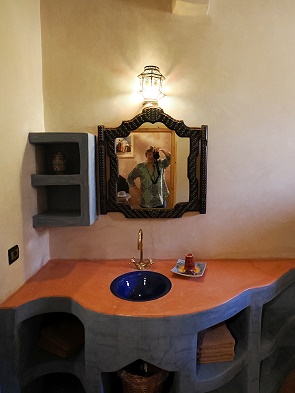 Alle Zimmer in der Casa Juan sind individuell gestaltet und wunderschön. Wir durften überall hereinschauen und bewunderten die Tadelakt-Bäder, die Bilder und Kunstgegenstände und die Gestaltung. So hat man an einigen Stellen zum Beispiel leere Flaschen in die Tadelaktwände zum Badezimmer eingebaut, damit das Licht farbig hindurchscheint.
