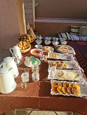 Das Frühstück nimmt man oben auf der schönen Dachterrasse ein, möglichst vor 9:00 Uhr - dann kann man an einigen Tischen auf dem Dach noch im Schatten sitzen. Der überdachte Platz hat erst nach der Frühstückszeit wieder Schatten, wenn die Sonne höher steht. Zu unserer Überraschung gab es hier sogar ein Buffet, an dem wir uns bedienen konnten. Dort stand das übliche Angebot an Pfannkuchen, Brot und Kuchen. Dazu in kleinen Töpfen mit Deckel Marmeladen, Honig, Amlou, Butter und Schmelzkäse. Dazu noch Tomaten mit Knoblauch.