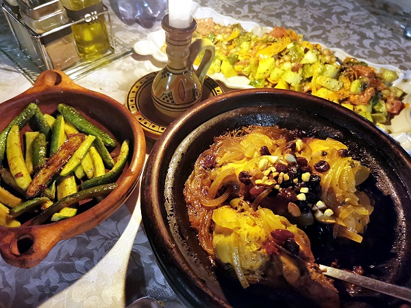 Am ersten Abend hatten wir eine leckere Gemüsesuppe, danach gab es bunten Salat mit Äpfeln und Granatapfel-Kernen und Karotten. Hauptgang war eine Tajine mit Huhn, Zwiebeln, Mandeln und Rosinen. Die war richtig lecker, saftig und lange gut durchgeschmort. Hier gab es drei große Bruststücke mit wenig Knochen, dazu geschmorte Zuchini. Nachspeise war dann Joghurt mit Honig, Erdnüssen und Fruchtstücken.
