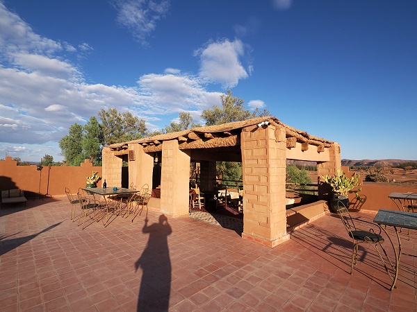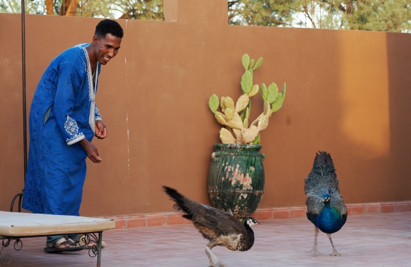Das gesamte Personal im Hotel ist freundlich und sehr hilfsbereit. Im Garten im Innenhof laufen Pfaue herum, die auch unerwünschte Besucher wie Skopione in Schach halten. Es gibt hier weder Pool noch Fernseher, das haben wir aber auch nicht vermisst. Das WLAN ist in den Räumen rund um das kleine Büro gut, es gibt einen Schreibtisch und Sitzgelegenheiten in der Nähe. Der Lehm der dicken Wände schirmt gut ab, so dass das Signal oben auf der Dachterrasse oder im Zimmer zu schwach ist. Da half mal wieder unser kleiner Mobile-router mit marokkanischer SIM-Karte.