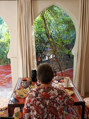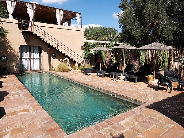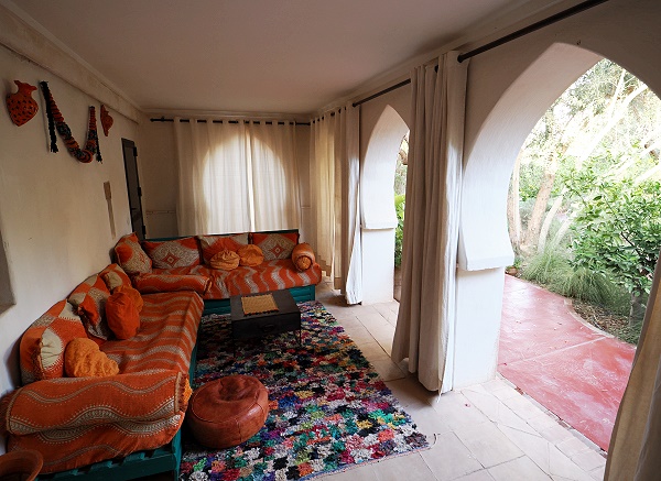 Wir verbrachten drei Nächte in Les Trois Paons, planten einen entspannten Tag im Garten ein und unternahmen mit dem Auto einen Ausflug nach Taroudant. Während unseres Aufenthalts waren wir die einzigen Gäste und konnten Pool und Garten nach Belieben nutzen. Eine Panoramaterrasse über dem Pool bietet Sitzgelegenheiten mit Blick auf den Hohen Atlas. Allerdings war die Aussicht durch die Bäume eingeschränkt, und die Kissen waren vom letzten Regen noch feucht. Daher verbrachten wir lieber Zeit vor unserer gemütlichen Suite in einer Gartenecke.