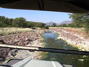 Als wir den Fluss überqueren, finden wir einen Kudu-Schädel mit imposantem Gehörn. Hier war wohl ein Löwe oder Leopard am Werk, das fresslustige Raubtier sehen wir aber nicht. Crosley wird den Schädel bestimmt später holen und er wird wohl die Wände in der Lodge zieren. Wenn er sich mit seinen beiden Landsleuten unterhält, ist immer wieder ein Schnalzen und Klicken zu hören. Die Sprache des Damara-Stammes besitzt neun Klicklaute und es machte uns Spaß, den Gesprächen zuzuhören.