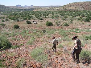 Bei der Fahrt durch das steinige Tal quietschte und ächzte der alte Jeep bedenklich. Er wurde ausgewählt für diese Fahrt, weil er von allen Fahrzeugen der Lodge die größte Bodenfreiheit hat. Da sich kein Nashorn blicken ließ, mussten wir auch nicht viel laufen. Ein kurzer Spaziergang hoch auf einen Aussichtspunkt war in der Mittagshitze schon anstrengend genug. Am Morgen hatten wir uns noch topfit gefühlt, aber während unserer Führer auf der Suche nach Tieren im Gelände unterwegs waren, hielt Michael ein Mittagsschläfchen unterm Schattendach des Jeeps. Ich hatte Kopfschmerzen, die auch nicht wieder weggingen. Kein Wunder, denn das alte Vehikel stank wie die Pest nach Benzin und Abgasen. 7 Stunden reine Fahrzeit in heftigem Gelände, immer in Untersetzung mit geringer Geschwindigkeit, und die Benzoldämpfe und CO-Wolken hatten uns kirre gemacht. Am Abend war uns richtig schlecht, wir wollten nur noch mit einer Kopfschmerztablette ins Bett. Das waren Nebenwirkungen wie bei einem leichten Sonnenstich.