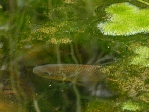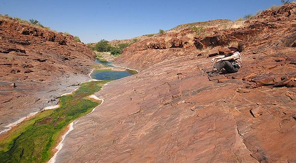 Am Ende der Reise, am Umkehrpunkt, führte uns Crosley noch zu einem sehr idyllischen Ort. Eine Quelle inmitten der Wildnis, üppiges Grün inmitten trockener Graslandschaft. Auf riesigen Granitfelsen hatten sich einige Tümpel gebildet, die malerisch mit giftgrünen Algen zugewachsen waren. Darin entdeckten wir zahlreiche große Kaulquappen, die in der Sonne golden schimmerten. Bunte Libellen in Rot, Blau und Grün-gelb schwirrten umher und legten im Wasser ihre Eier ab. Auf einmal tauchte der Kopf einer Schildkröte an der Wasseroberflache auf. In dem Tümpel lebten mindestens 2 der flinken Tiere, die im algenbewachsenen Wasser schwer zu fotografieren waren. Sie tauchen nur Sekundenbruchteile an der Oberfläche auf, um gleich darauf schon wieder abzutauchen. Wir hätten stundenlang dort sitzen können und die Natur beobachten.