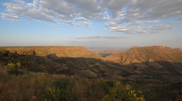 Dann sahen wir noch ein paar Trappen und auch Zebras, ein paar Gnus und jede Menge Vögel. Das Licht am späten Nachmittag war wunderschön, das Gras leuchtet richtig im Licht der untergehenden Sonne. An der Abbruchkante angekommen hat man einen schönen Weitblick in die benachbarten Täler, die Lodge ist von hier aus nicht zu sehen.