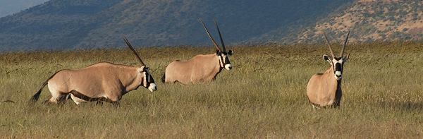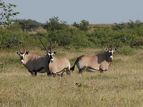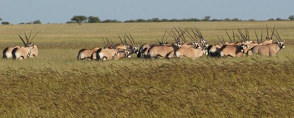 Nach einer Weile Fahrt ohne Tiere trauten wir dann unseren Augen kaum. Die ganze Ebene war voll mit Oryx Antilopen, auch Gemsbock oder Spießbock genannt und das Wappentier Namibias. Eine riesige Herde dieser beeindruckenden Tiere graste vor uns. Bei dieser Gattung aus der Unterfamilie der Pferdeböcke haben beide Geschlechter lange Hörner, die bis zu 1,50 Meter lang werden können, und die typische schwarz-weiße Gesichtsmaske. So sieht eine Herde dicht gedrängter Tiere besonders beeindruckend aus. Die Bullen haben immerhin eine Standhöhe von bis zu 180 cm und erreichen ein Maximalgewicht von 200 kg. Die Weibchen sind mit 160 cm und 160 kg nur unwesentlich kleiner.