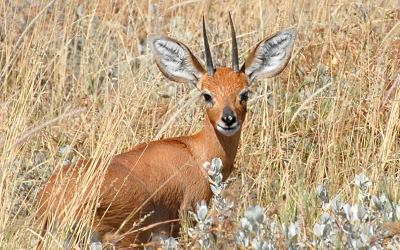 Die Steinantilope (Raphicerus campestris) ist eine 11 kg schwere Zwergantilope, die sich schwer fotografieren lässt. Meist versteckt sich das kleine Tier mit einer Schulterhöhe von 50 cm im hohen Gras. Nur die Männchen tragen kurzer, gerade, glatte und senkrechte Hörner.