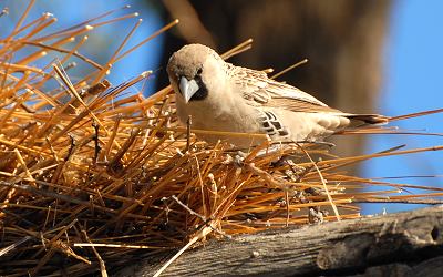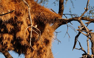 Der Siedelweber (Philetairus socius) baut die größten Gemeinschaftsnester, die unter Vögeln bekannt sind. Diese sind immer ein gutes Fotomotiv und man kann die Vögel beim Anflug und beim Nestbau gut beobchten. So wie an diesem Nest am Wasserloch von Okaukuejo im Morgenlicht. Die Verbreitung des Siedelwebers ist auf Zentralnamibia und die Zentralkalahari (nördliche Kapprovinz und Südbotswana) beschränkt.
