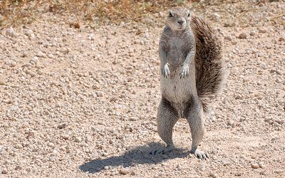 Das Kap-Borstenhörnchen (Xerus inauris) bildet große Kolonien in der Steppe von Etosha. Die kleinen Tiere können Außentemperaturen von über 39°C vertragen und Bodentemperaturen von bis zu 62°C. Da sie tagaktiv sind, wird der buschige Schwanz als Sonnenschutz genutzt. Für Allradwagen, die in Arika querfeldein fahren, sind die ausgedehnten Bausysteme der kleinen Hörnchen eine ständige Gefahr.