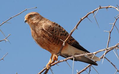 Im Nationalpark leben viele Raubvögel, die sich gut fotografieren lassen, wenn sie auf ihrem Aussichtspunkt über dem Grasland sitzen. Auf dem ersten Bild ist ein Steppenfalke (White-eyed Kestrel, Greater Kestrel, Falco rupicoloides) zu sehen, der im Gegensatz zu allen anderen Falken eine weißliche Iris hat.